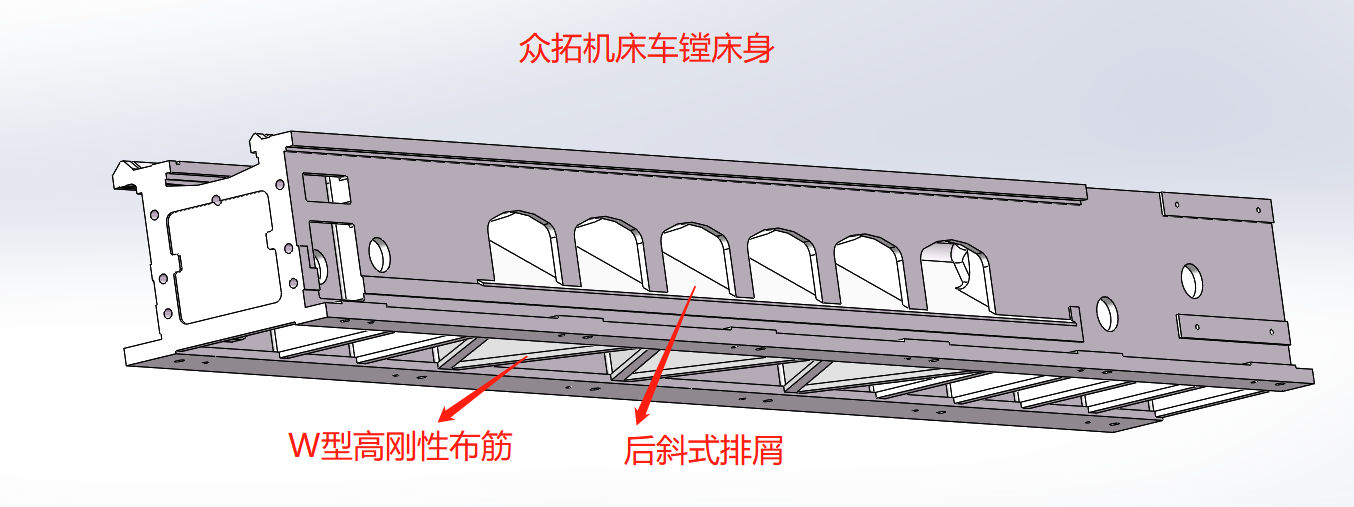 機(jī)床床面為平-V結(jié)構(gòu),采用高強(qiáng)度樹脂砂鑄造,床面進(jìn)行中頻淬火處理,硬度為HRC45-55,并經(jīng)退火處理,充分消除其鑄造時熱脹冷縮變形量及內(nèi)應(yīng)力,也可分散切削時的振動;中頻淬火深度較深,利于機(jī)床二次重磨。機(jī)床床體剛性強(qiáng),承載力大,穩(wěn)定性好。拖板采用刮膠處理,由于該材料中含有潤滑元素,使其動靜摩擦系數(shù)相差較小,配合潤滑油一起大大降低了拖板與床身導(dǎo)軌面的摩擦,防止爬行。機(jī)床床身鑄有向后排屑用拱形門,切屑直接排到接屑盤中,排屑、清理方便。