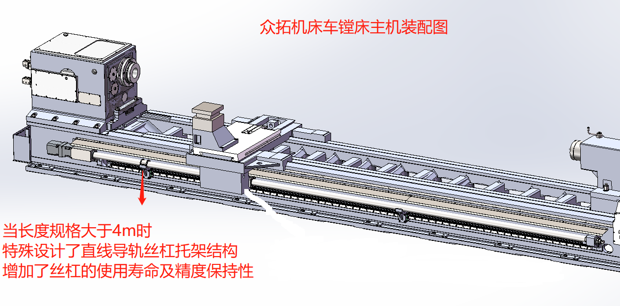 為設(shè)備的內(nèi)孔鏜削加工提供足夠的剛性支撐。拖板絲杠中置,絲桿軸承支座裝配時充分找正,并采用預(yù)拉伸結(jié)構(gòu),提高了剛性及穩(wěn)定性。